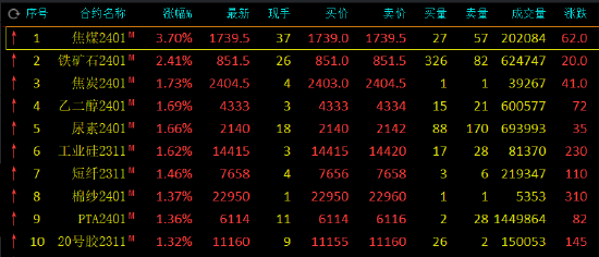 午盤收盤,國內(nèi)期貨主力合約有漲有跌。焦煤(1771, 72.50, 4.27%)漲超3%,鐵礦(853, 10.00, 1.19%)石漲超2%,焦炭(2429, 65.00, 2.75%)、乙二醇(EG)、尿素、工業(yè)硅漲超1.5%。跌幅方面,白糖(7121, -99.00, -1.37%)、棕櫚(7486, -82.00, -1.08%)油、丁二烯橡膠(14385, 65.00, 0.45%)(BR)、SC原油、滬錫(217050, 230.00, 0.11%)跌超1%。