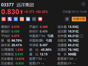 內(nèi)房股部分上漲,遠(yuǎn)洋集團(tuán)漲超82%。消息面上,遠(yuǎn)洋集團(tuán)于前一日發(fā)布公告,公司連同其附屬公司、合營(yíng)公司及聯(lián)營(yíng)公司就2023年8月的協(xié)議銷售額約為人民幣19.7億元;協(xié)議銷售樓面面積約為20萬(wàn)平方米;協(xié)議銷售均價(jià)為每平方米約人民幣9900元。2023年1月1日到8月31日的累計(jì)協(xié)議銷售額約為人民幣401.2億元;累計(jì)協(xié)議銷售樓面面積約為320.83萬(wàn)平方米;累計(jì)協(xié)議銷售均價(jià)為每平方米約人民幣12500元。