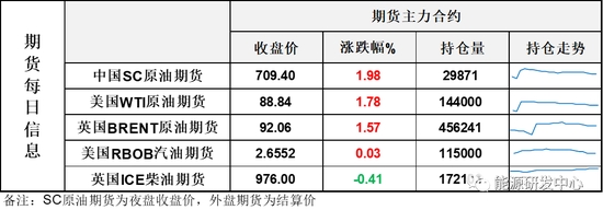 【1】WTI主力原油期貨收漲1.55美元,漲幅1.78%,報(bào)88.84美元/桶;布倫特主力原油期貨收漲1.42美元,漲幅1.57%,報(bào)92.06美元/桶;INE原油期貨收漲1.98%,報(bào)709.4元。