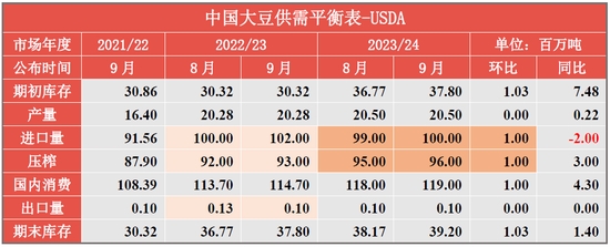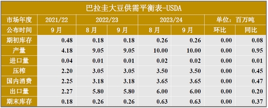在本月的美農(nóng)報告中,2023/24年度豆粕(4000, -84.00, -2.06%)產(chǎn)量下調(diào)20萬噸,總使用量下調(diào)20萬噸,兩者相抵,導(dǎo)致期末庫存未變。具體情況見下表: