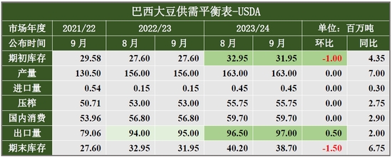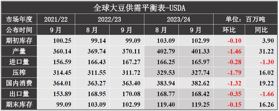 全球:本次報告下調(diào)了2023/24年度美豆的產(chǎn)量,全球大豆產(chǎn)量也因此下調(diào);同時報告亦下調(diào)全球大豆的期末庫存。