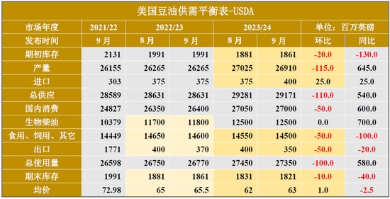 在本月的美農(nóng)報告中,上調(diào)了2022/23年度豆油的生柴和出口量,下調(diào)了食用飼用使用量,下調(diào)了期末庫存。導(dǎo)致2023/24年度期初庫存下調(diào),又因2023/24年度豆油進口量上調(diào)幅度遠小于產(chǎn)量下調(diào)的幅度,雖然出口及食用飼用使用量亦下調(diào),期末庫存仍下調(diào)1000萬英磅。具體情況見下表: