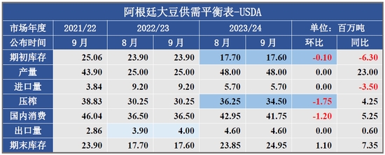 阿根廷:本次報告上調(diào)2022/23年度阿根廷的出口量,因此期末庫存略下調(diào)。2023/24年度的期初庫存也隨之上調(diào),此外新作壓榨量下調(diào)了175萬噸。