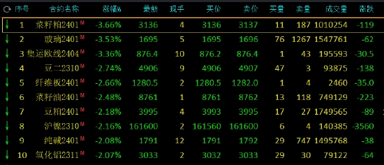 午盤收盤,國內(nèi)期貨主力合約跌多漲少。菜粕、玻璃(1702, -20.00, -1.16%)、集運(yùn)指數(shù)(歐線)跌超3%,豆二、菜油、豆粕(4007, 3.00, 0.07%)、滬鎳(161280, -850.00, -0.52%)、丁二烯橡膠(14245, -45.00, -0.31%)(BR)、純堿、氧化鋁跌超2%。漲幅方面,苯乙烯(EB)、尿素漲超3%。