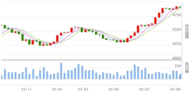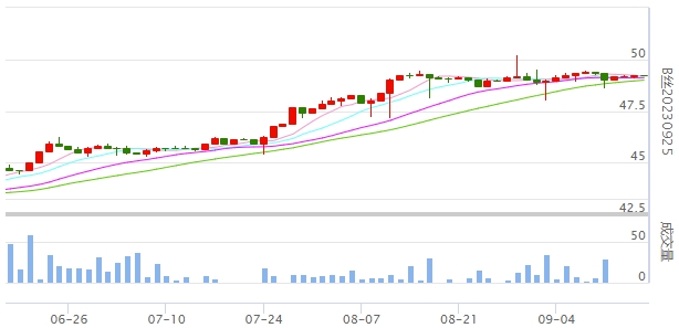 今日(2023年09月15日,周五)中國繭絲綢交易市場生絲指數(shù)微漲0.06%收于4911.97點(diǎn),本周生絲指數(shù)下跌0.31%。B絲(商檢4A級(jí)生絲):230925合約報(bào)平收于49.23萬元;240325合約上漲0.15萬元報(bào)收于49.47萬元;240925合約上漲0.12萬元報(bào)收于48.39萬元。230925生絲合約日線