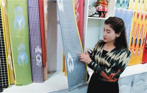吉亞麗人艾特萊斯絲綢有限公司一位店長(zhǎng)展示今年改良設(shè)計(jì)新圖案的艾德萊斯絲綢