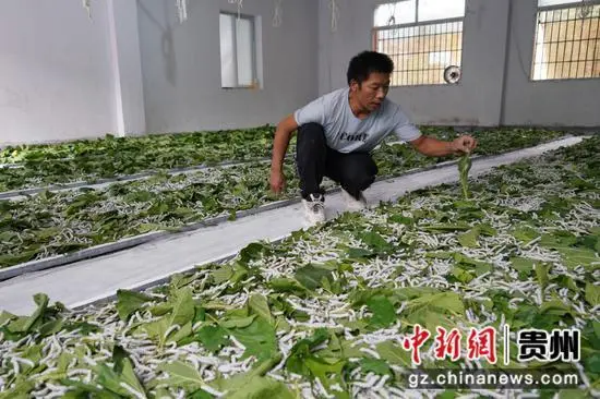 連日來,在貴州省黃平縣重安鎮(zhèn)重興村養(yǎng)蠶室里,三張四眠的桑蠶剛剛睡醒,四眠五齡蠶食量大增,養(yǎng)蠶人潘彬圍著幾張桑蠶仔細(xì)查看一番后,提著一背簍的桑葉又給蠶寶寶添加口糧。
