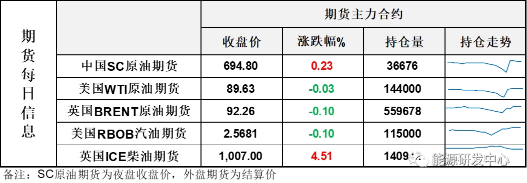 【1】WTI主力原油期貨收跌0.03美元,跌幅0.03%,報(bào)89.63美元/桶;布倫特主力原油期貨收跌0.09美元,跌幅0.1%,報(bào)92.26美元/桶;INE原油期貨收漲0.23%,報(bào)694.8元。