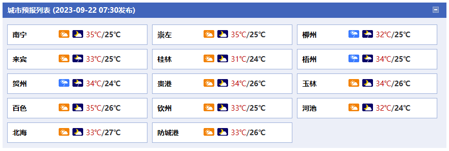 南寧市:今天白天到晚上多云、局地有陣雨或雷雨,東南風1~2級,最高氣溫35℃,最低氣溫25℃。
