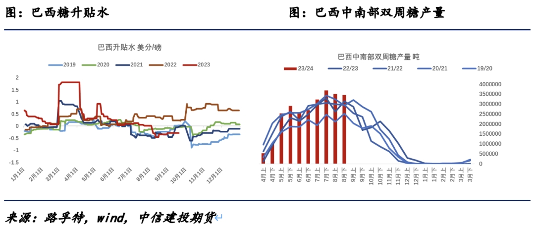 天氣情況利于巴西的甘蔗壓榨,雙周產量持續(xù)創(chuàng)下新高,含水乙醇貼水原糖超10美分/磅,雙周制糖比也持續(xù)在50%以上的水平,現(xiàn)貨的壓力持續(xù),賣壓也導致升貼水價格處于同期低位水平。