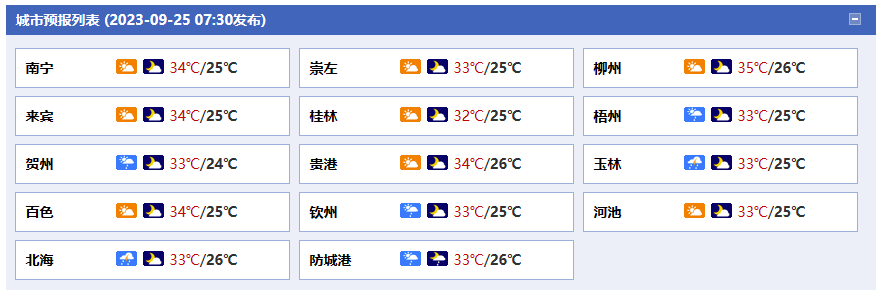 南寧市:今天白天到晚上,多云、局地有陣雨,偏東風(fēng)1~2級,最高氣溫34℃,最低氣溫25℃。