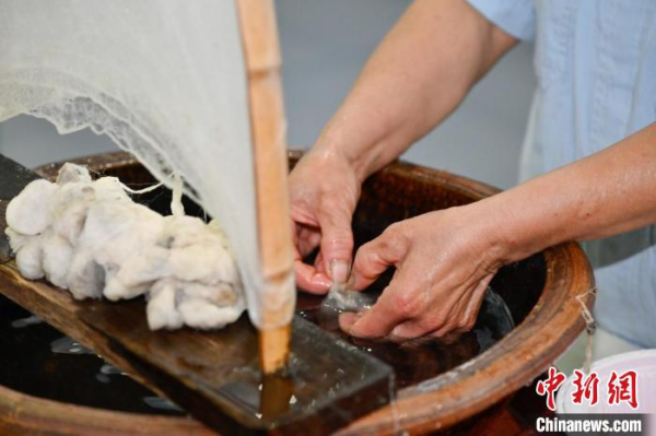 泡水后的蠶繭潔白如雪,只見(jiàn)年過(guò)六旬的姚來(lái)英將蠶繭撕開(kāi)一個(gè)小口,剝開(kāi)后撐大,拉扯成薄如蠶翼的繭膜,層層套在模具上,重復(fù)疊加8到10次后,就拉成了一個(gè)雪白綿軟、晶瑩剔透的綿兜。
