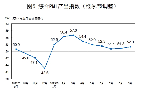9月份,綜合PMI產(chǎn)出指數(shù)為52.0%,比上月上升0.7個百分點(diǎn),表明我國企業(yè)生產(chǎn)經(jīng)營活動總體擴(kuò)張加快。