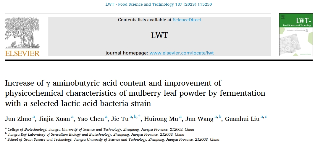 近日,江蘇科技大學生物技術學院屠潔副教授課題組在桑葉活性成分γ-氨基丁酸(γ-aminobutyric acid,GABA)定向富集及同步改善桑葉粉食用特性研究中取得創(chuàng)新進展,相關成果發(fā)表在農(nóng)林科學TOP期刊LWT-Food Science and Technology上。該論文第一作者是我院20級碩士研究生卓俊,通訊作者為屠潔副教授。LWT-Food Science and Technology是中科院一區(qū)期刊,目前最新影響因子6.0。