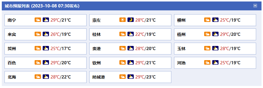 今天白天到9日白天,全區(qū)多云到晴,其中桂林、賀州、梧州、玉林、貴港、南寧等市局地有陣雨。