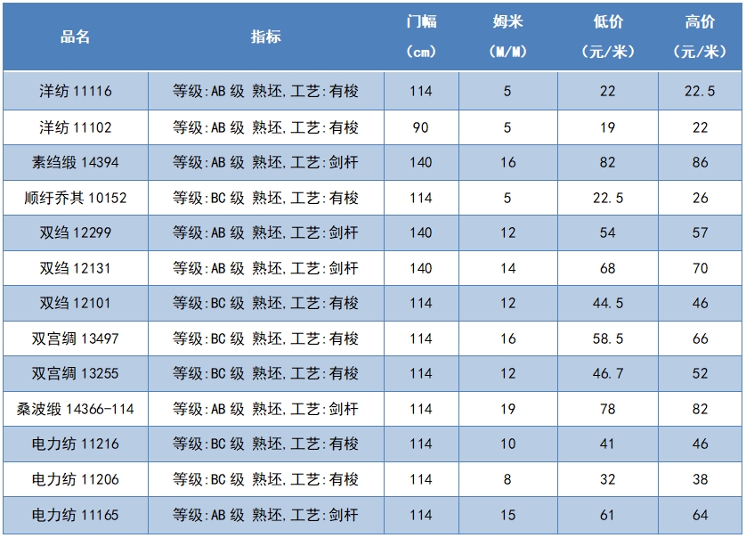 本周綢緞指數(shù)協(xié)作單位成交價格區(qū)間