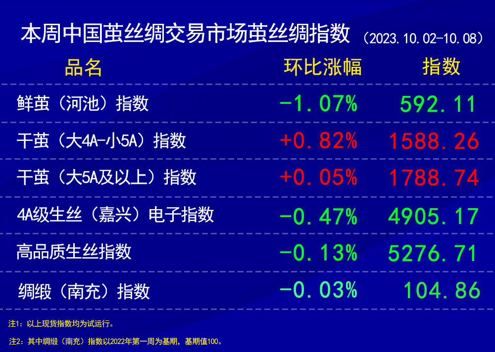 本周涉及長假,又是秋繭集中上市期,繅絲企業(yè)和織造企業(yè)買賣觀望行為也都有所增加,兩方面因素造成市場協(xié)作單位所報成交量比節(jié)前減少,成交主體內(nèi)的價格相差不大。本周高品質(zhì)生絲指數(shù)環(huán)比上周略收綠基本持平。