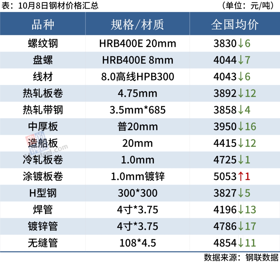 10月8日,國內(nèi)鋼材市場小幅下跌為主,唐山遷安普方坯含稅漲20報(bào)3470元/噸。從成交方面來看,市場成交乏力,實(shí)際成交暗降情況明顯。