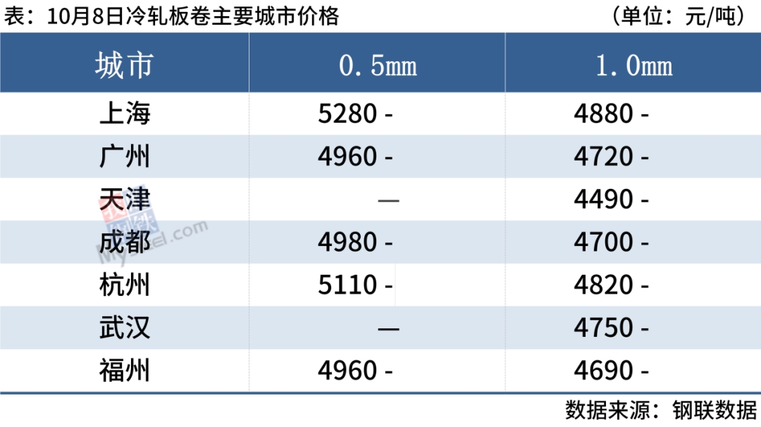 熱軋板卷:10月8日,全國24個(gè)主要城市4.75mm熱軋板卷均價(jià)3892元/噸,較上個(gè)交易日下跌12元/噸。熱卷(3754, -44.00, -1.16%)市場價(jià)格變化不大,整體庫存總量進(jìn)一步回升,同時(shí)成交相對一般,并無節(jié)后好轉(zhuǎn)得表現(xiàn)。長流程鋼廠以消耗庫存為主,獨(dú)立電爐企業(yè)節(jié)前已經(jīng)備貨完成,節(jié)日期間采購積極性不高。下游需求節(jié)中補(bǔ)庫情緒不佳,鋼廠發(fā)貨加速,投機(jī)需求尚未啟動(dòng),累庫或?qū)⒊掷m(xù),預(yù)計(jì)9日全國熱軋板卷價(jià)格或?qū)②吶踹\(yùn)行。