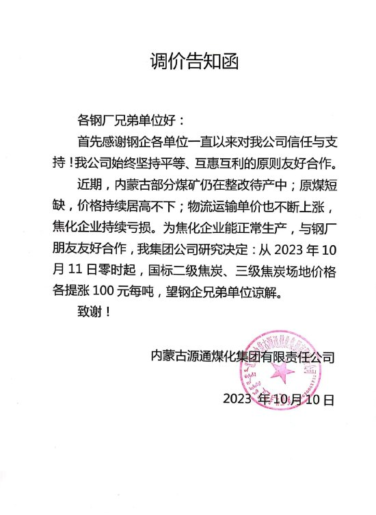 據(jù)找鋼網(wǎng),內(nèi)蒙古源通煤化集團(tuán)發(fā)布焦炭價(jià)格調(diào)價(jià)函:從2023年10月11日零時(shí)起,國標(biāo)二級焦炭、三級焦炭場地價(jià)格各提漲100元每噸。