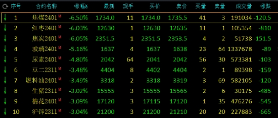 午盤收盤,國內(nèi)期貨主力合約大面積飄綠,焦煤(1760, -26.00, -1.46%)、焦炭(2392, -17.00, -0.71%)、紅棗(12730, -240.00, -1.85%)跌超6%,玻璃(1654, -9.00, -0.54%)跌超5%,尿素跌近5%,燃油、豆二、生豬、棉花(17160, -200.00, -1.15%)、滬鋅跌超3%,菜粕、甲醇(2442, -14.00, -0.57%)、液化石油氣(LPG)、豆粕(3824, -7.00, -0.18%)、純堿、燒堿跌超2%。漲幅方面,集運(yùn)指數(shù)(歐線)、工業(yè)硅、滬鎳(150900, -1730.00, -1.13%)漲超1%。