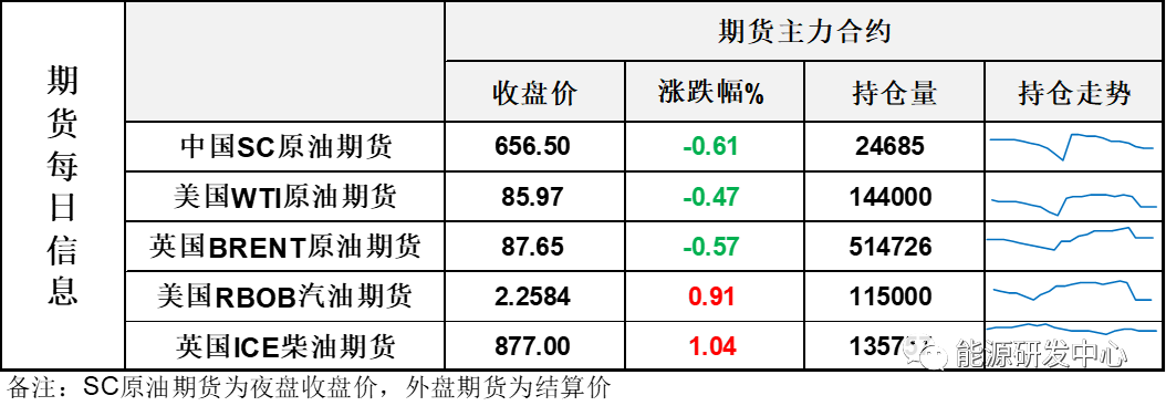 【1】WTI主力原油期貨收跌0.41美元,跌幅0.47%,報85.97美元/桶;布倫特主力原油期貨收跌0.5美元,跌幅0.57%,報87.65美元/桶;INE原油期貨收跌0.61%,報656.5元。