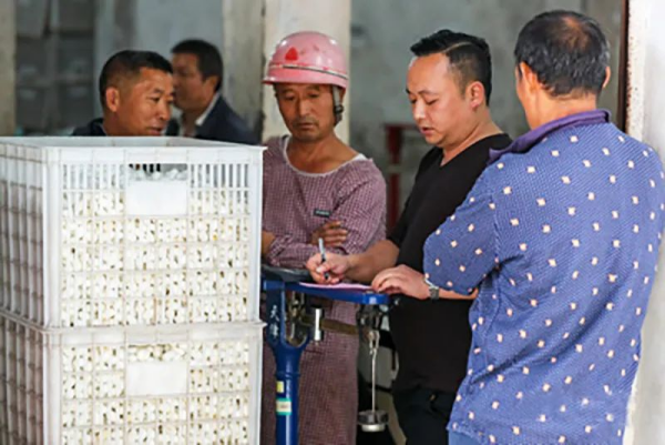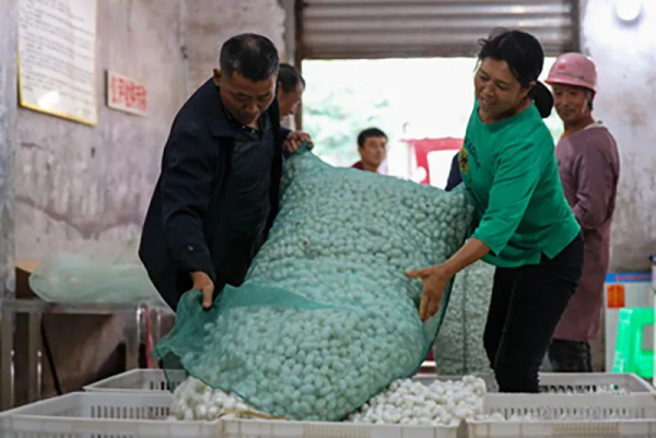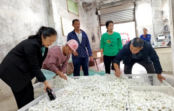 采摘下來的蠶繭被及時送往附近繭站進行銷售。在嘉樂鎮(zhèn)蠶繭站,前來售繭的蠶農(nóng)排起了長隊。工作人員正有序分工對鮮繭進行評級、定價、稱重、結算,現(xiàn)場一派忙碌。