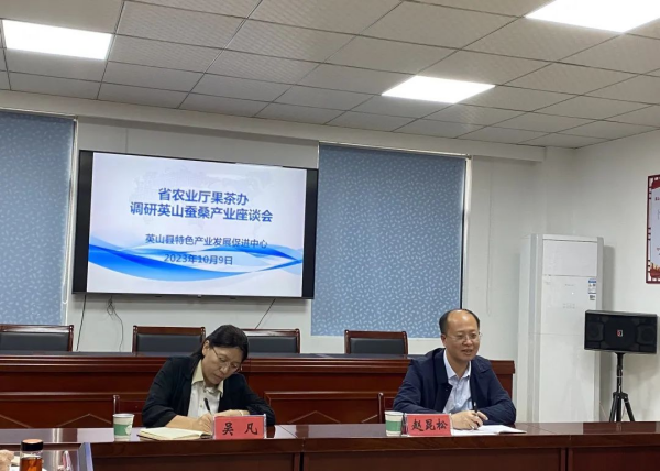 10月9日,湖北省農(nóng)業(yè)農(nóng)村廳果茶辦公室副主任趙昆松,省農(nóng)科院經(jīng)濟(jì)作物研究所副研究員吳凡到英山開展蠶桑產(chǎn)業(yè)發(fā)展調(diào)研并召開座談會(huì)??h特色產(chǎn)業(yè)發(fā)展促進(jìn)中心主任馮勁松、副主任肖寶江、總工程師雷達(dá)以及湖北一品桑生物科技有限公司、湖北雍華絲綢制品有限公司、湖北夢絲家綠色保健制品有限公司、湖北夢絲匠工蠶絲綢緞?dòng)邢薰镜绕髽I(yè)相關(guān)負(fù)責(zé)人參加調(diào)研座談。