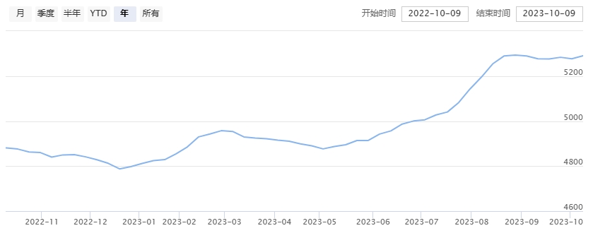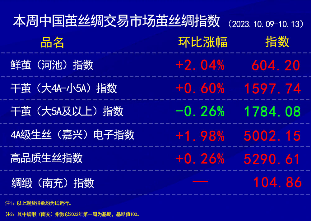 今日(2023年10月13日,周五)中國(guó)繭絲綢交易市場(chǎng)生絲指數(shù)上漲0.58%收于5002.15點(diǎn),本周生絲指數(shù)上漲1.98%。B絲(商檢4A級(jí)生絲):231025合約上漲0.24萬(wàn)元報(bào)收于50.01萬(wàn)元;240325合約上漲0.54萬(wàn)元報(bào)收于50.79萬(wàn)元;240925合約上漲0.60萬(wàn)元報(bào)收于49.29萬(wàn)元。