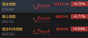 10月17日消息,港股三大指數(shù)收漲,截至收盤,恒生指數(shù)(17773.34, 132.98, 0.75%)漲0.75%,報(bào)17773.34點(diǎn),恒生科技指數(shù)(3836.05, 24.37, 0.64%)漲0.64%,國企指數(shù)漲0.71%。盤面上,核心科技股多數(shù)上漲,小米集團(tuán)漲超3%,京東集團(tuán)漲超2%、阿里巴巴、網(wǎng)易、騰訊控股(302.2, 1.00, 0.33%)跟漲;汽車股漲跌不一,恒大汽車(0.61, 0.17, 38.64%)漲超38%,小鵬汽車跌超3%;金屬板塊漲幅靠前,天齊鋰業(yè)(42.95, 2.45, 6.05%)漲超6%;中資券商股普漲,國聯(lián)證券(3.54, 0.12, 3.51%)漲超3%;半導(dǎo)體概念股漲勢活躍,華虹半導(dǎo)體(19.68, 0.56, 2.93%)漲近3%;蘋果概念股集體下挫,通達(dá)集團(tuán)(0.103, -0.01, -5.50%)跌超5%。