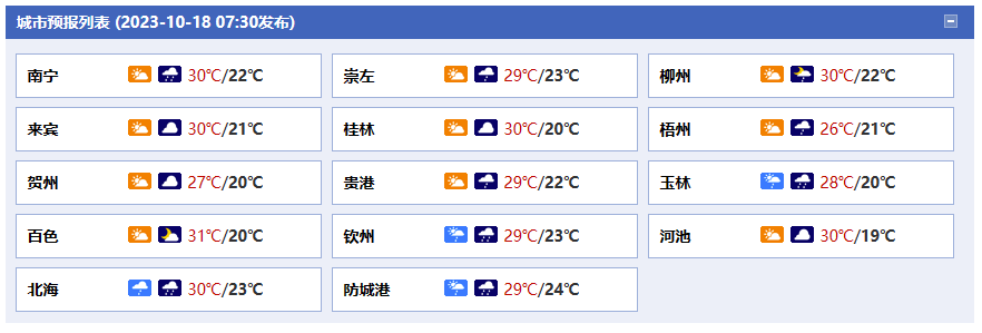 南寧市:今天白天多云、局部有陣雨,今天晚上陰天有小到中雨,偏東風轉東北風2~3級,最高氣溫30℃,最低氣溫22℃。