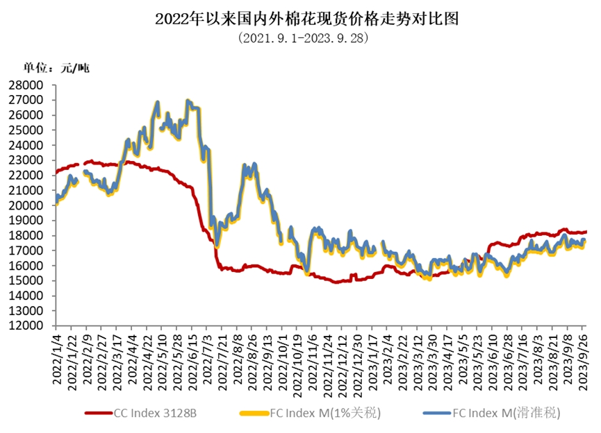 月初,受美棉減產(chǎn)預(yù)期影響,ICE棉花期貨主力合約一度接近90美分/磅,之后市場(chǎng)對(duì)美國(guó)通脹的擔(dān)憂加劇,美聯(lián)儲(chǔ)加息預(yù)期增強(qiáng),商品市場(chǎng)承壓,棉價(jià)有所回落。9月,ICE期棉主力合約月均結(jié)算價(jià)在87.42美分/磅,環(huán)比上漲1.77美分,漲幅2%。中國(guó)進(jìn)口棉價(jià)格指數(shù)FCIndex M月均為98.99美分/磅,環(huán)比上漲1.65美分;月底為99.72美分/磅,環(huán)比上漲0.06美分,1%關(guān)稅下折人民幣17623元/噸,低于同期中國(guó)棉花價(jià)格指數(shù)(CCIndex3128B)597元。