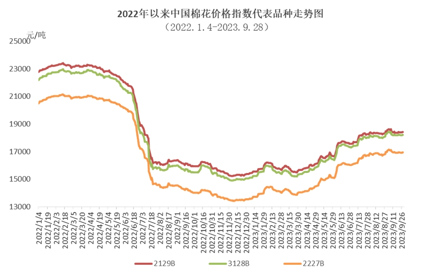 9月,國(guó)內(nèi)棉花現(xiàn)貨市場(chǎng)供應(yīng)較為充裕,儲(chǔ)備棉競(jìng)拍成交率依然較高,滑準(zhǔn)稅配額逐漸下發(fā)至紡織企業(yè),國(guó)內(nèi)棉價(jià)月初上漲至年內(nèi)新高,之后小幅回調(diào)趨于穩(wěn)定。月中下旬因紡織旺季不及預(yù)期,國(guó)內(nèi)棉紗成品庫(kù)存增加且銷售價(jià)格下行,紡織企業(yè)對(duì)原料采購(gòu)力度有所轉(zhuǎn)弱,國(guó)儲(chǔ)棉及現(xiàn)貨市場(chǎng)成交略有下降。國(guó)際市場(chǎng),受美棉減產(chǎn)和美聯(lián)儲(chǔ)加息預(yù)期增強(qiáng)等因素影響,國(guó)際棉價(jià)震蕩上漲。