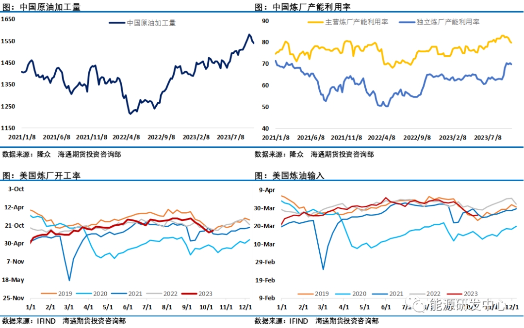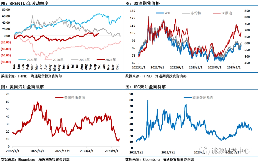 因巴以沖突的影響,投資者注意力都集中在了供應端的變化,事實上10月初油價暴跌之際,需求端的疲弱反應還是值得投資者關(guān)注,目前全球各地區(qū)汽油裂解差均處于低位,一直因供應緊張而表現(xiàn)抗跌的歐洲柴油裂解差近期也有走弱跡象,上周三大機構(gòu)均不同程度對需求端預期有所下調(diào),高油價對需求的抑制已經(jīng)在9月有所體現(xiàn),2024年需求增速下降將是大概率事件。短期內(nèi)油價雖然因地緣因素沖高,但后續(xù)持續(xù)性如果沒有需求端的配合,預計也很難維持高位。一旦地緣風險降溫,投資者注意力重新回到原油市場供需層面,油價預計難以保持當前的強勢格局。