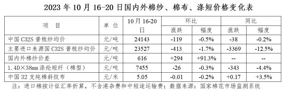 本周(2023年10月16-20日),國內(nèi)外棉花價格延續(xù)跌勢;國內(nèi)外棉紗價格繼續(xù)回落;滌綸短纖價格走弱。