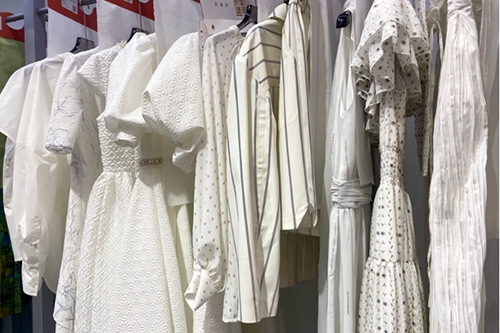 在蘇州羅曼羅蘭時(shí)尚集團(tuán)旗下另一品牌NFF(New Fiber Fabric)新纖維面料的展位,羅曼羅蘭新纖維女裝產(chǎn)品總監(jiān)徐華柱向記者介紹了一款主推產(chǎn)品滌綸瑋彈防曬印花布,該產(chǎn)品采用今年新型紗線——抗紫外線防曬原紗,該紗線為異型截面紗,具有扁平結(jié)構(gòu),一定程度上能增強(qiáng)面料的抗紫外線輻射作用,同時(shí)也讓面料更具透氣性,透氣性預(yù)計(jì)高出常規(guī)面料50%左右。