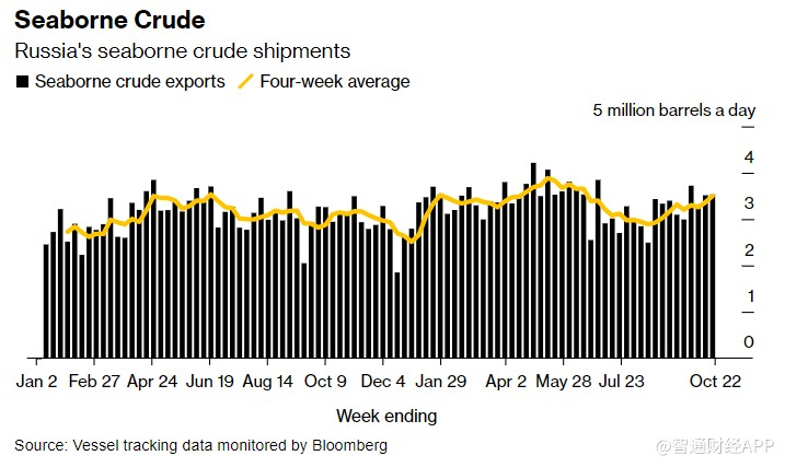 俄羅斯的石油出口量正在穩(wěn)步攀升。油輪跟蹤數(shù)據(jù)顯示,在截至10月22日的一周內(nèi),每天約有353萬桶原油從俄羅斯港口運出,比前七天增加2萬桶/日。受此影響,波動性較小的四周平均值升至350萬桶/日,為6月以來的最高水平,在過去兩個月里,出口量增加了約61萬桶/日。