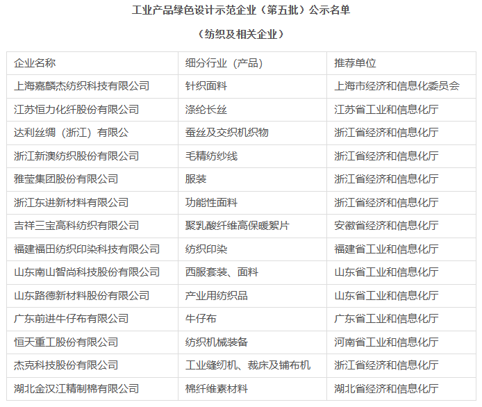 日前,工業(yè)和信息化部發(fā)布工業(yè)產(chǎn)品綠色設(shè)計(jì)示范企業(yè)(第五批)名單公示,共有107家企業(yè)上榜,其中十余家紡織企業(yè)入圍。