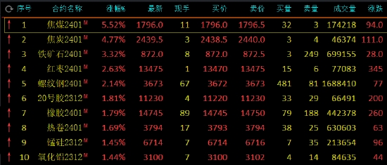 午盤(pán)收盤(pán),國(guó)內(nèi)期貨主力合約漲多跌少。焦煤(1780, 13.00, 0.74%)漲超5%,焦炭(2421, 16.00, 0.67%)漲超4%,鐵礦(870, -0.50, -0.06%)石漲超3%,紅棗(13350, -95.00, -0.71%)、螺紋鋼(3673, 9.00, 0.25%)漲超2%,20號(hào)膠(NR)、橡膠(14695, 110.00, 0.75%)漲近2%。跌幅方面,SC原油、低硫燃料油(LU)、生豬、液化石油氣(LPG)、集運(yùn)指數(shù)(歐線(xiàn))跌超2%。
