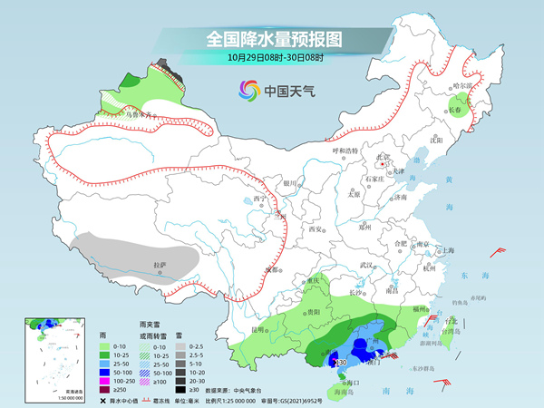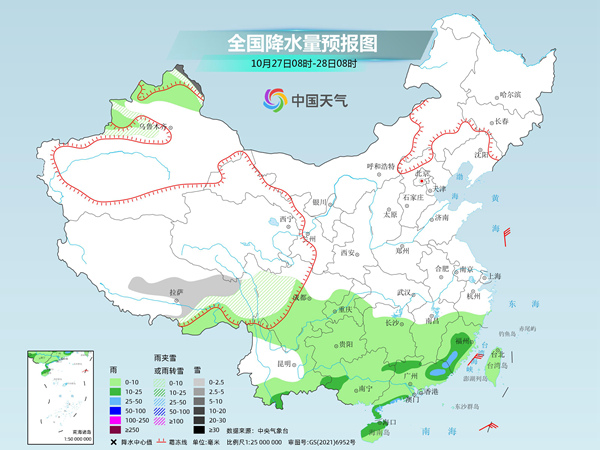 周日,江南降雨基本結束,最強降雨會出現(xiàn)在廣東、廣西,局地有大暴雨。新疆北部、西藏中部等地的部分地區(qū)有小到中雪或雨夾雪,其中,新疆北疆北部的部分地區(qū)有大到暴雪;江南南部、華南大部等地的部分地區(qū)有中到大雨,其中,廣西東南部、廣東中西部等地的部分地區(qū)有暴雨,局地大暴雨。