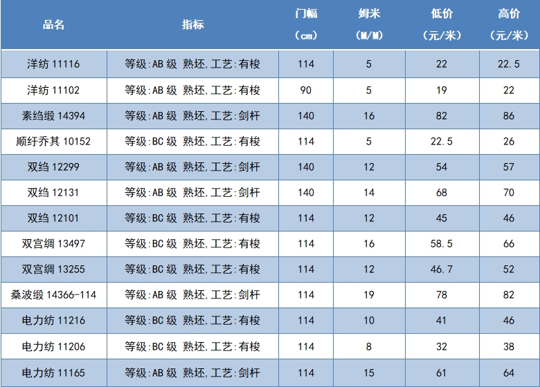 本周綢緞指數(shù)協(xié)作單位成交價(jià)格區(qū)間