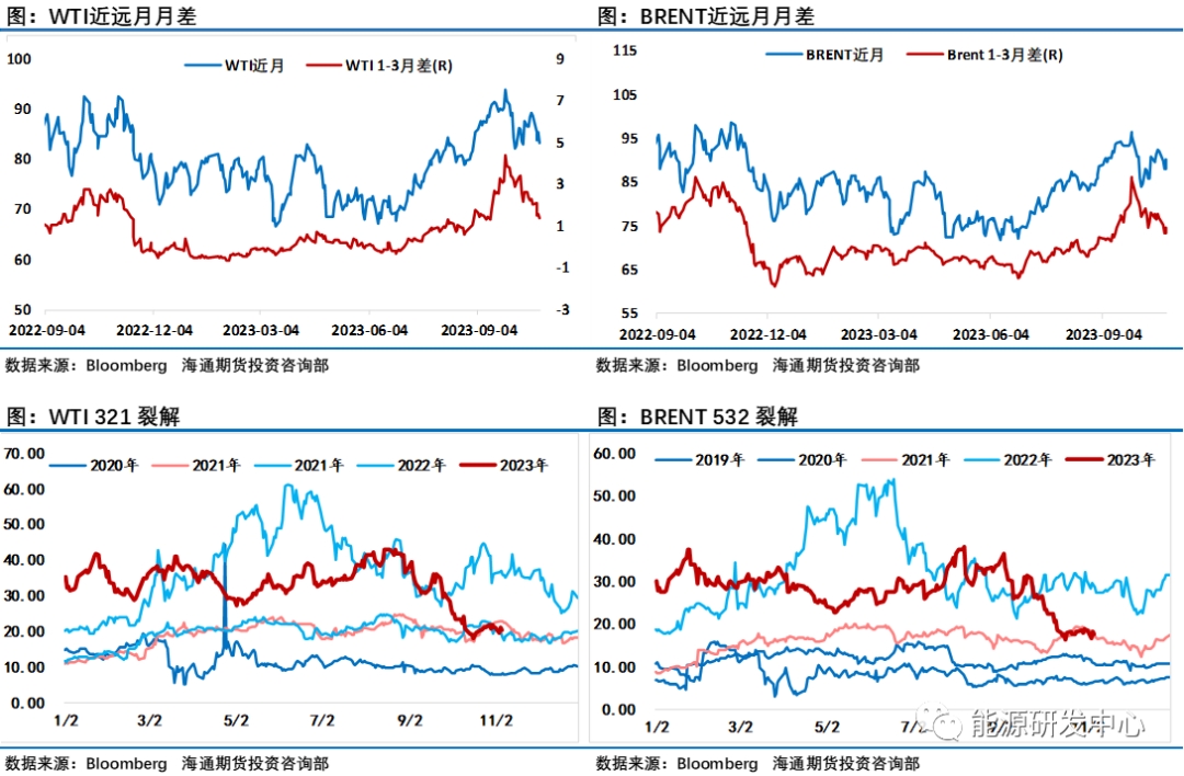 不過(guò)我們透過(guò)地緣因素迷霧,觀察過(guò)去一段時(shí)間原油市場(chǎng)的表現(xiàn)來(lái)看,油價(jià)的驅(qū)動(dòng)正在從歐佩克+減產(chǎn)推動(dòng)油價(jià)重心上移開始發(fā)生變化。典型的盤面指標(biāo)方面從9月份開始全球成品油裂解差持續(xù)走弱,油價(jià)10月初急跌階段,成品油市場(chǎng)比原油表現(xiàn)的更弱,顯然減產(chǎn)推動(dòng)的高油價(jià)開始傷害到了需求端。進(jìn)入10月之后原油市場(chǎng)月間差快速轉(zhuǎn)弱,即便是全球原油庫(kù)存降至5年底低點(diǎn),庫(kù)欣庫(kù)存維持低位,巴以沖突帶來(lái)供應(yīng)的擾動(dòng)均未能重新推動(dòng)原油市場(chǎng)月間差保持強(qiáng)勢(shì),顯然資金已經(jīng)從三季度積極看漲油價(jià)轉(zhuǎn)變?yōu)樗募径阮A(yù)期更為謹(jǐn)慎。最新持倉(cāng)數(shù)據(jù)顯示上周WTI、布倫特原油投機(jī)凈多頭寸均有所回落。最新數(shù)據(jù)顯示,CFTC數(shù)據(jù)顯示截至10月24日當(dāng)周,WTI原油期貨投機(jī)性凈多頭頭寸減少3862手至179489手。而洲際交易所(ICE)布倫特原油期貨投機(jī)性凈多頭頭寸減少10766手合約至216696手合約。