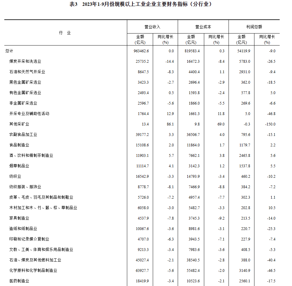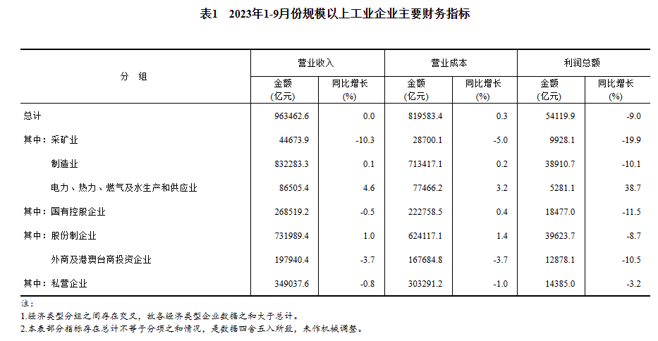 1—9月份,全國規(guī)模以上工業(yè)企業(yè)實現(xiàn)利潤總額54119.9億元,同比下降9.0%,降幅比1—8月份收窄2.7個百分點(按可比口徑計算,詳見附注二)。