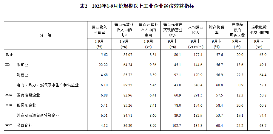 9月末,規(guī)模以上工業(yè)企業(yè)每百元資產(chǎn)實現(xiàn)的營業(yè)收入為80.1元,同比減少5.8元;人均營業(yè)收入為177.4萬元,同比增加6.0萬元;產(chǎn)成品存貨周轉(zhuǎn)天數(shù)為20.0天,同比增加1.2天;應(yīng)收賬款平均回收期為63.0天,同比增加5.9天。