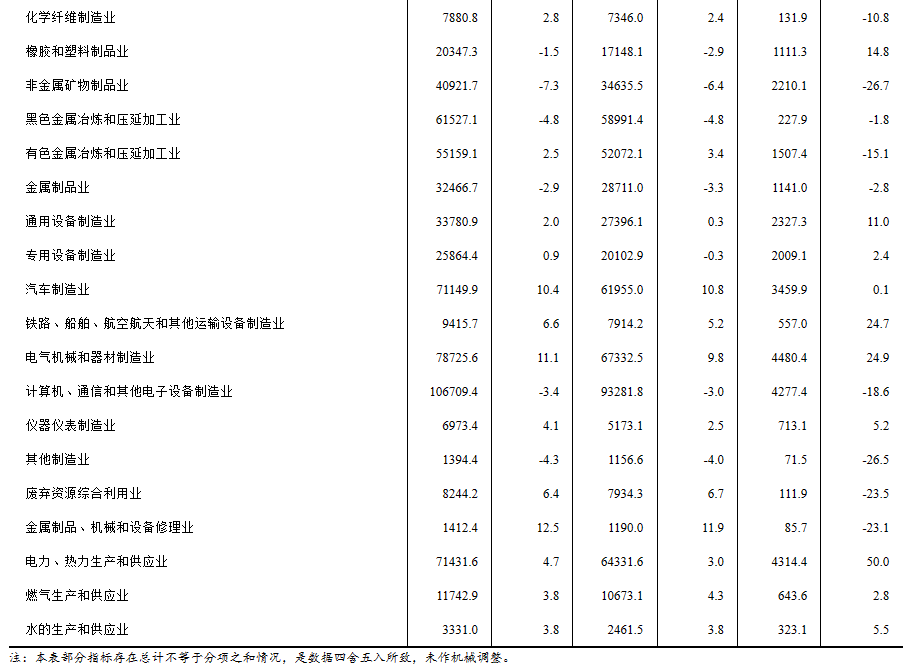 1—9月份,主要行業(yè)利潤情況如下:電力、熱力生產(chǎn)和供應(yīng)業(yè)利潤總額同比增長50.0%,電氣機(jī)械和器材制造業(yè)增長24.9%,通用設(shè)備制造業(yè)增長11.0%,專用設(shè)備制造業(yè)增長2.4%,汽車制造業(yè)增長0.1%,黑色金屬冶煉和壓延加工業(yè)下降1.8%,石油和天然氣開采業(yè)下降9.4%,紡織業(yè)下降10.2%,農(nóng)副食品加工業(yè)下降15.1%,有色金屬冶煉和壓延加工業(yè)下降15.1%,計算機(jī)、通信和其他電子設(shè)備制造業(yè)下降18.6%,煤炭開采和洗選業(yè)下降26.5%,非金屬礦物制品業(yè)下降26.7%,石油、煤炭及其他燃料加工業(yè)下降40.4%,化學(xué)原料和化學(xué)制品制造業(yè)下降46.5%。