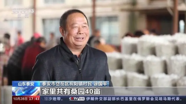 泰安市岱岳區(qū)祝陽鎮(zhèn)村民 徐國平:家里共有桑園40畝,一年能收四季,按照今年平均27塊錢一斤計算,光養(yǎng)蠶全年的收入有20多萬元。