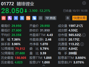 鋰礦股齊挫,贛鋒鋰業(yè)(28.05, -3.90, -12.21%)跌超12%。消息面上,贛鋒鋰業(yè)公布了前三季度的營業(yè)收入256.82億元,同比減少6.99%;歸屬于上市公司股東的凈利潤60.1億元,同比減少59.38%。