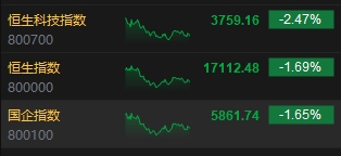 10月31日消息,港股三大指數(shù)低開低走,截至收盤,恒生指數(shù)(17112.48, -293.88, -1.69%)跌1.69%,報17112.48點,恒生科技指數(shù)(3759.16, -95.15, -2.47%)跌2.47%,國企指數(shù)跌1.65%。盤面上,核心科技股普跌,百度跌超4%,美團(tuán)跌近3%,阿里巴巴、騰訊控股(289.2, -6.20, -2.10%)、小米集團(tuán)跌超2%;汽車股集體下挫,零跑汽車(27.1, -5.10, -15.84%)跌近16%;蘋果概念股跌幅靠前,比亞迪電子(32.6, -3.70, -10.19%)跌超10%,舜宇光學(xué)科技(65.55, -3.75, -5.41%)跌超5%;醫(yī)藥外包概念股跌幅明顯, 凱萊英(101.5, -17.00, -14.35%)跌超14%;中資券商股逆勢飄紅,華泰證券漲超3%。