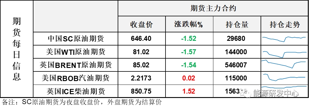 【1】WTI主力原油期貨收跌1.29美元,跌幅1.57%,報(bào)81.02美元/桶;布倫特主力原油期貨收跌1.33美元,跌幅1.54%,報(bào)85.02美元/桶;INE原油期貨收跌1.52%,報(bào)646.4元。