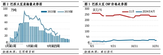 以大豆市場(chǎng)為例,10月第3周,巴西累計(jì)裝出大豆386.47萬(wàn)噸,去年10月為379.82萬(wàn)噸??紤]到出口總量同比21%的漲幅,這樣的裝運(yùn)進(jìn)度顯然偏慢。從巴西大豆的出口貼水CNF價(jià)格看,目前11月與2024年4月的價(jià)差較大,且近月的貼水價(jià)格震蕩下行。截至11月1日,巴西豆11月的貼水價(jià)格較9月1日下跌9.62%,而11月與明年4月的價(jià)差較9月1日下跌23.08%。因此,無(wú)論從近月的走勢(shì)還是近遠(yuǎn)月的價(jià)差走勢(shì),均反映目前出口壓力較大,且明年的豐產(chǎn)壓力將進(jìn)一步壓低貼水價(jià)格。